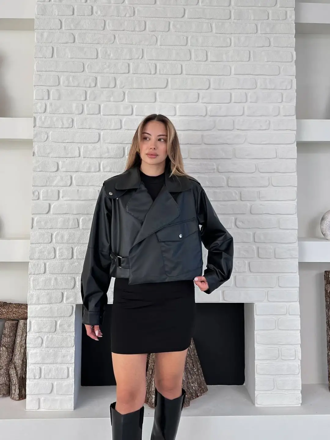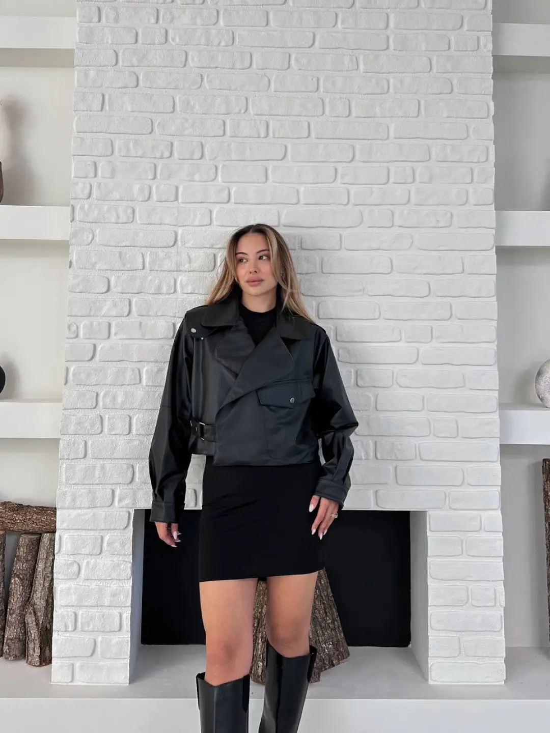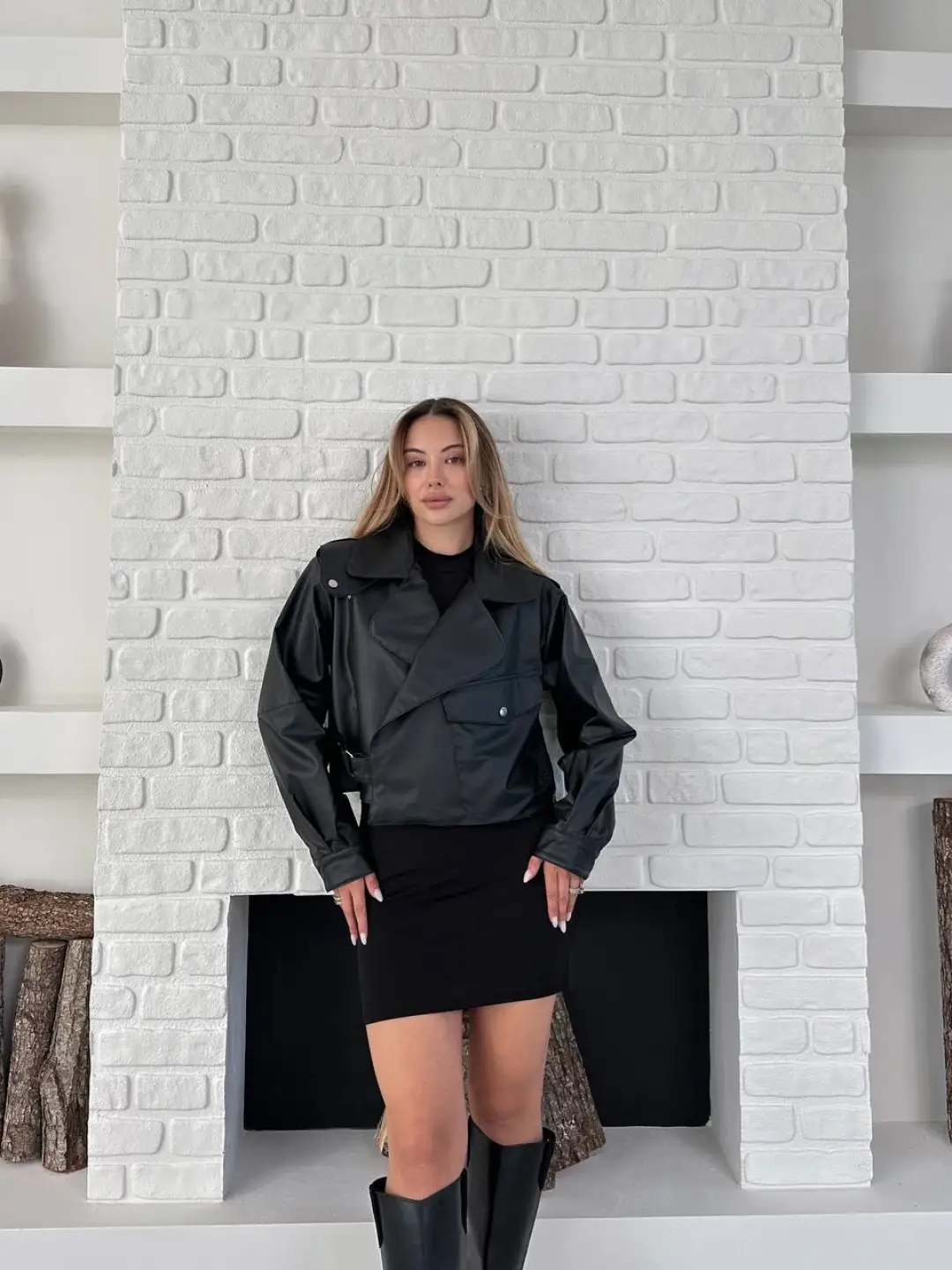 Kadınlar için şıklık ve tarzı bir arada sunan Cep Detaylı Asimetrik Deri Ceket.