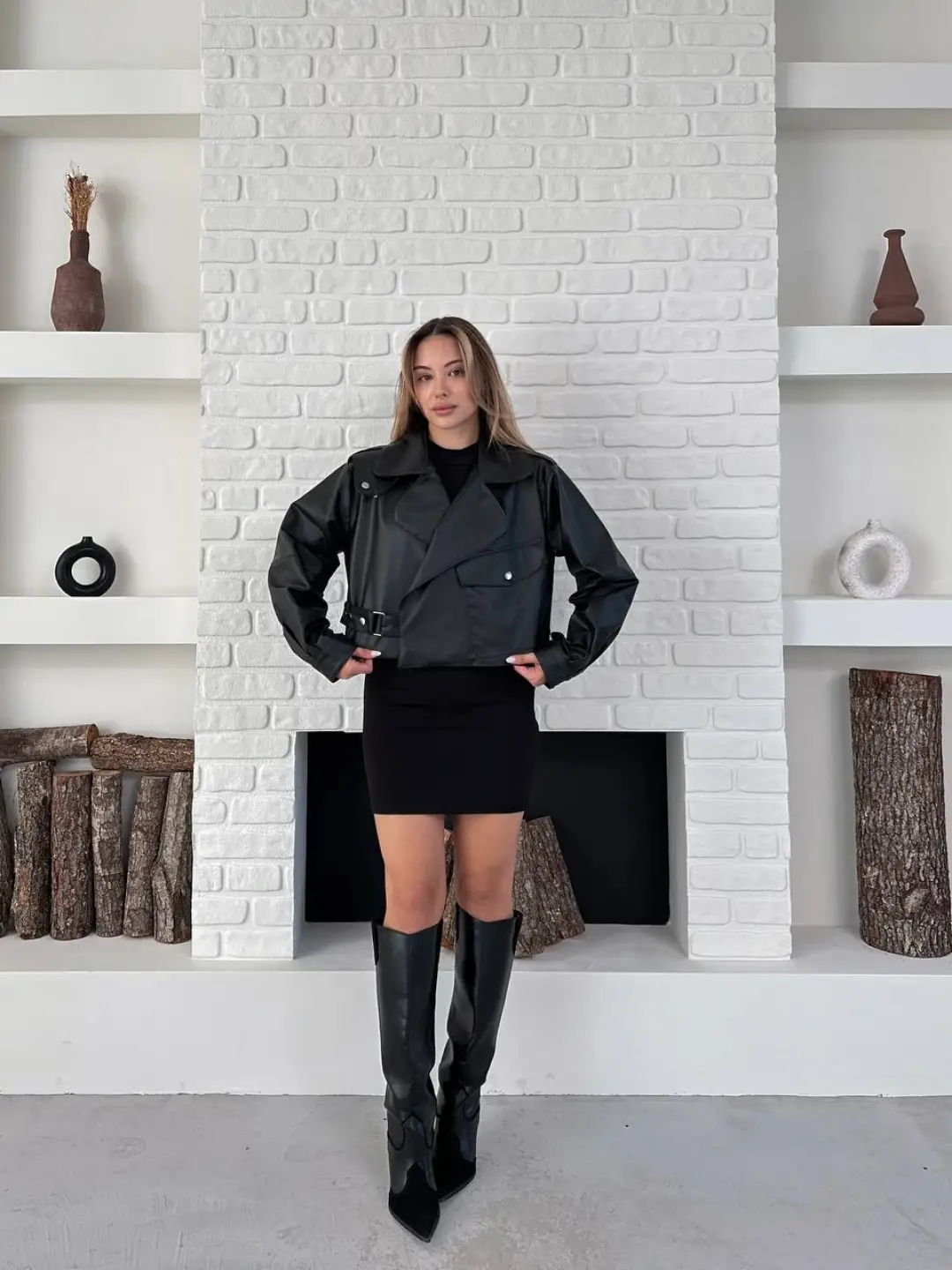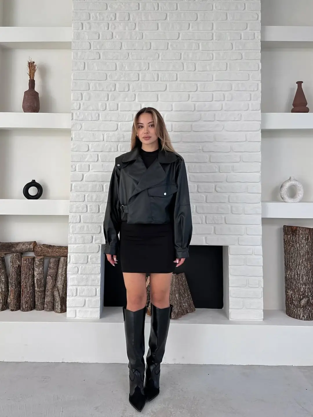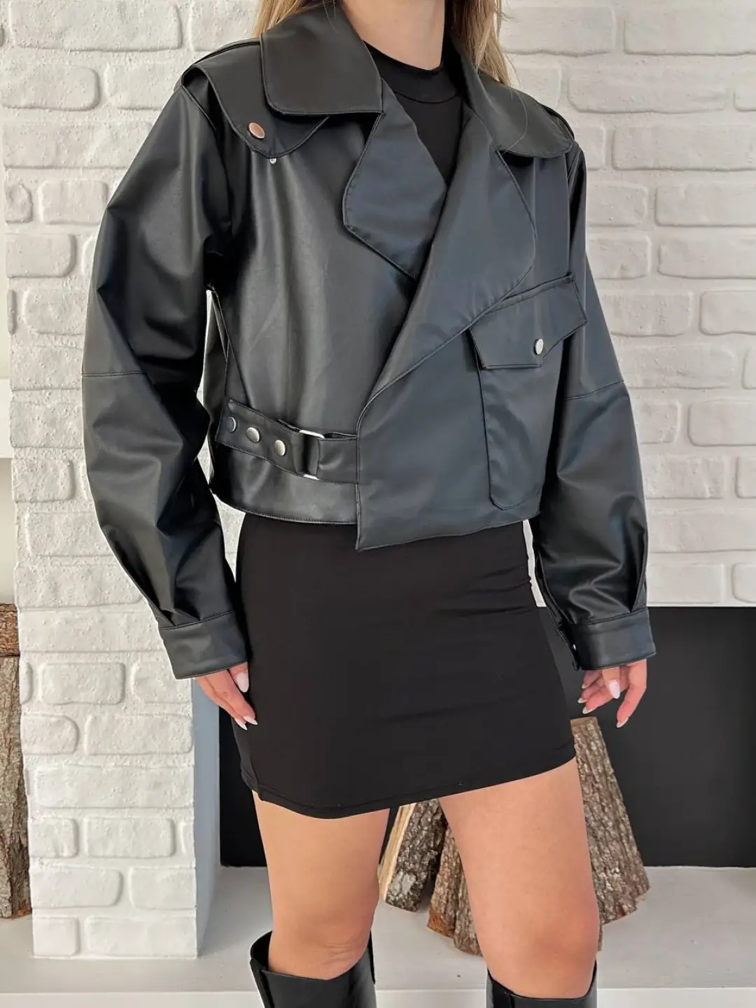 Kadınlar için şıklık ve tarzı bir arada sunan Cep Detaylı Asimetrik Deri Ceket.