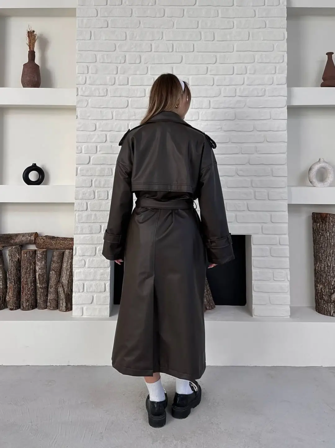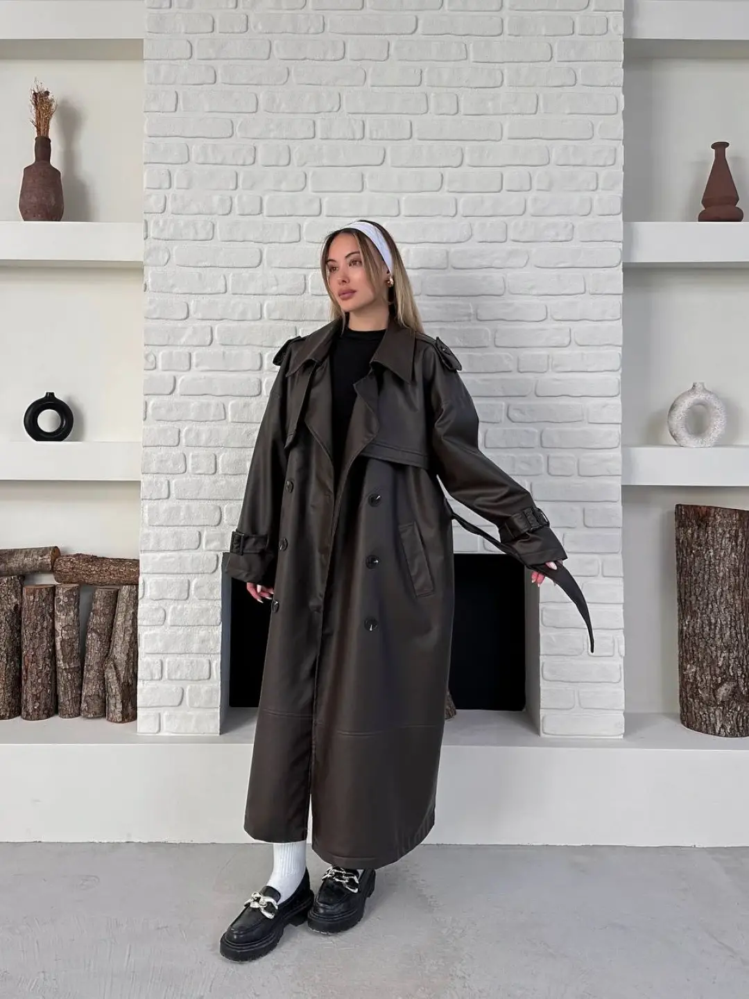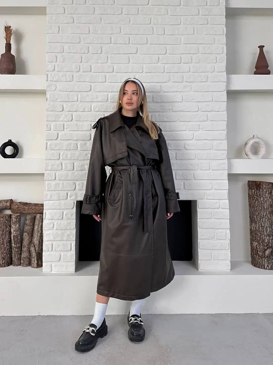 Suni Deri Uzun Kuşaklı Trenç Kahverengi