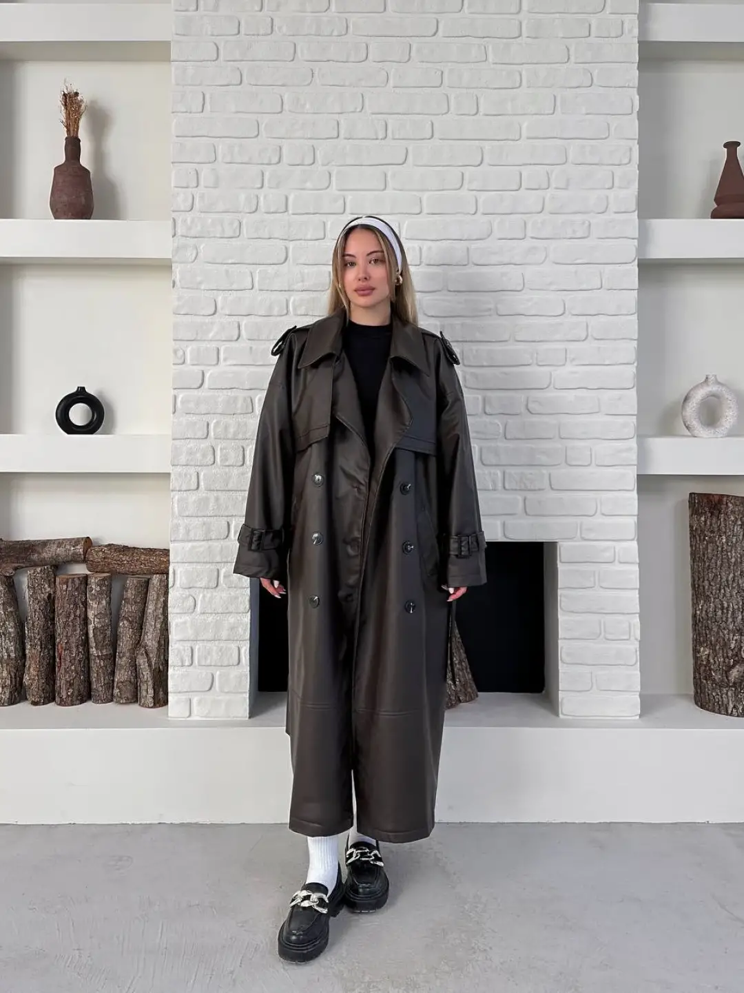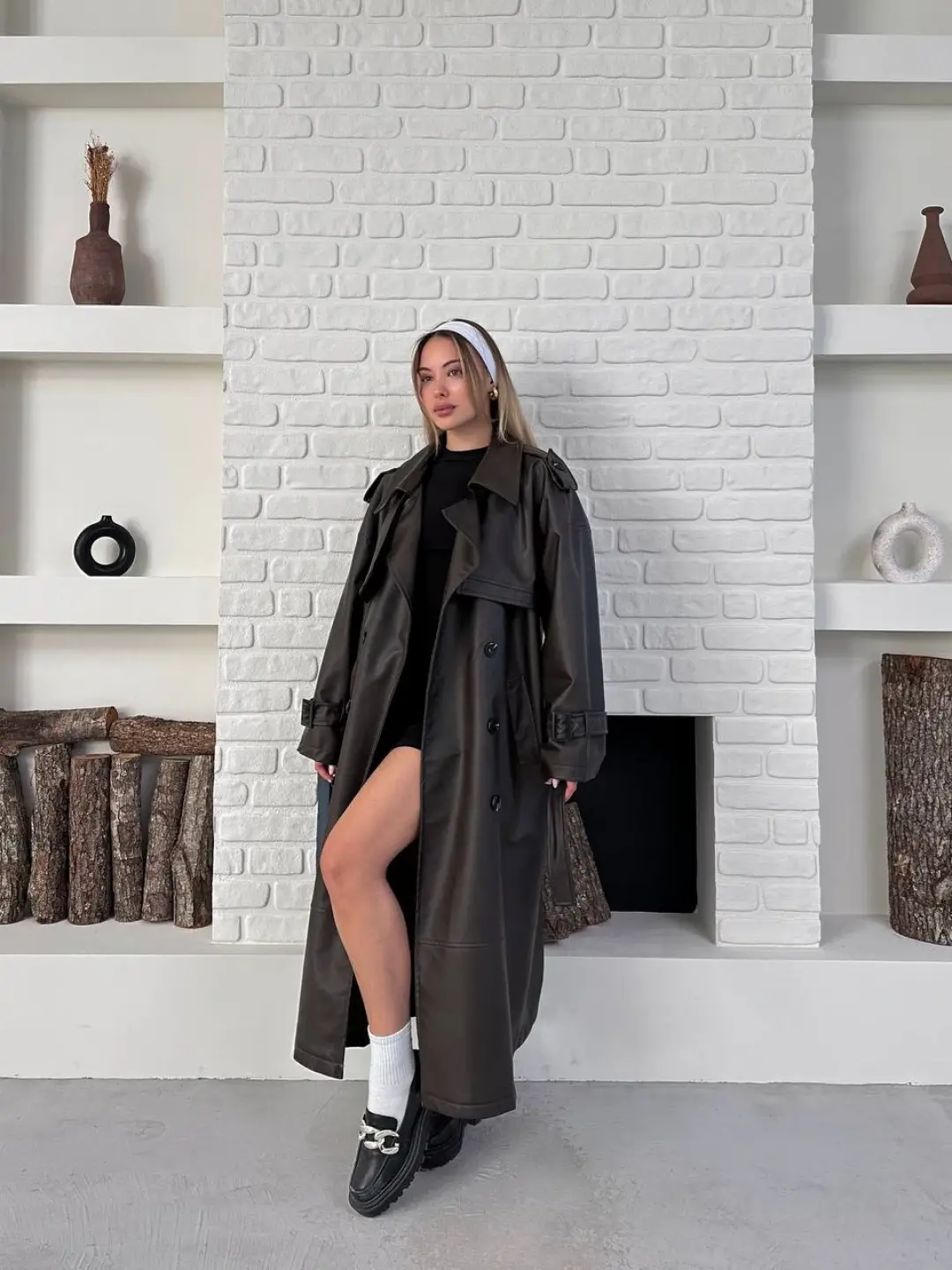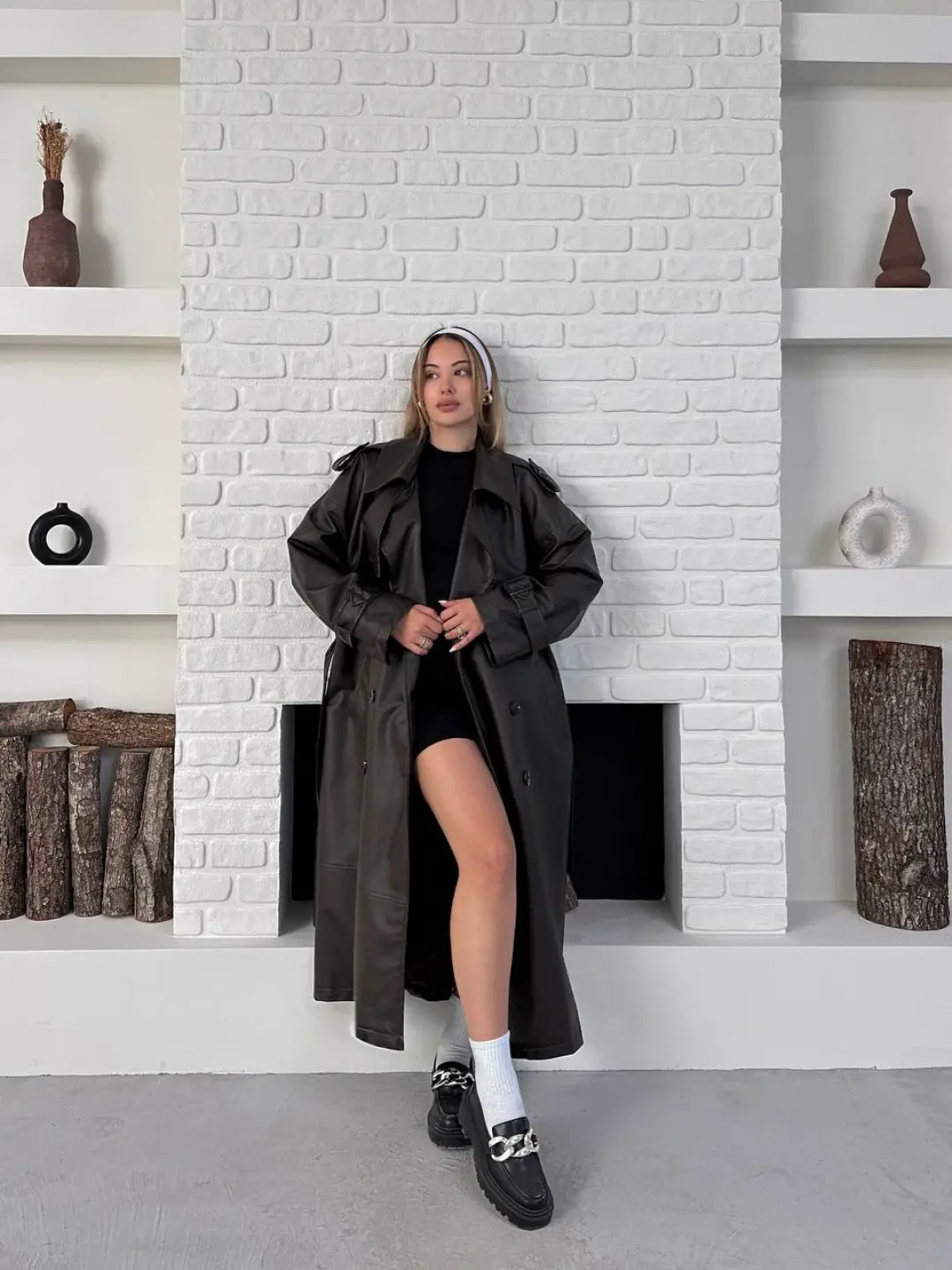 Suni Deri Uzun Kuşaklı Trenç Kahverengi